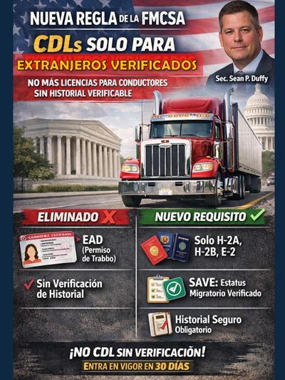 ⚠️ Esto significa más revisiones, más rechazos y posibles cancelaciones de CDLs no domiciliadas. Si tu empresa opera con conductores extranjeros o está en proceso de contratación, este cambio te afecta directamente.
